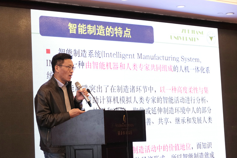 浙江大学机械工程学院教授、博士生导师杨将新教授解读智能制造。他表示,智能制造是产品个性化的发展和生产模式的转化,是质量优化、订单优化、排产优化、人员利用率的提高,是形成新的价值链和售后服务的尽责。开展智能制造的三大关键是信息化技术、智造技术以及客户需求。智能制造最终是向生产智能化、自动检测、服务智能化方面发展。