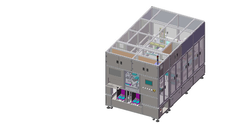 一套成像系统、两套机械手在线检测分析,针对方形聚合物软包电芯或成品电池进行在线全自动检测,将不良品挑选出来,设备前后端可与产线对接。