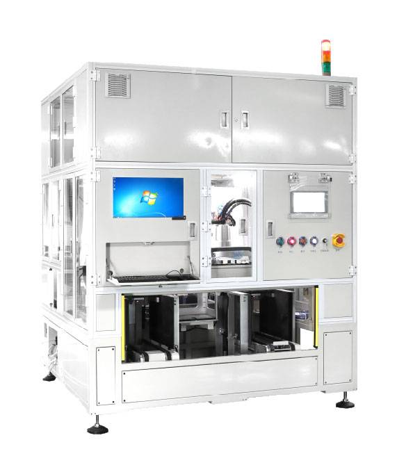 一种测试电池IV、开路电压、内阻、温度、条码扫描、极耳整形功能及电池自动输出的全自动化测试设备,采用四轴机器人+CCD定位技术+伺服+电池测试仪等方式,实现换型时间短、维护方便、操作简单。