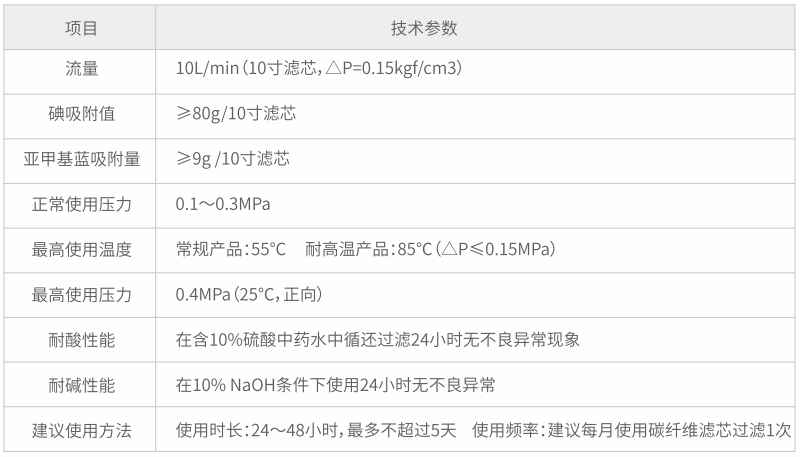 可适用于饮用水处理,除味脱色、除去余氯、吸附有机污染物,同时对液体中的固体微粒杂质有一定过滤作用,亦广泛适用于PCB电镀药水、工业污水等过滤。