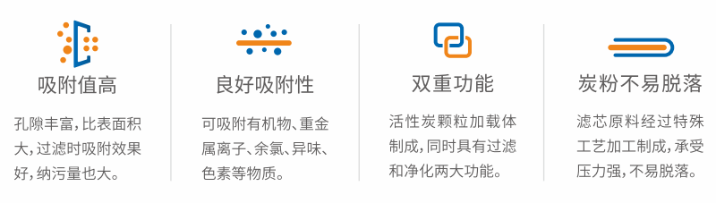 活性炭滤芯选用高品质活性炭作为主要原料,采用自动化设备压缩成型,然后加配无纺过滤布及聚乙烯防护网组装而成。