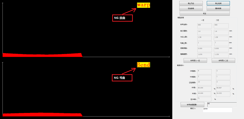 通过位置的信息可以得到PCB板的板厚曲线图,通过特定软件算法和翘曲度定义,计算出板翘曲度,并根据设定判断条件得出OK和NG板。