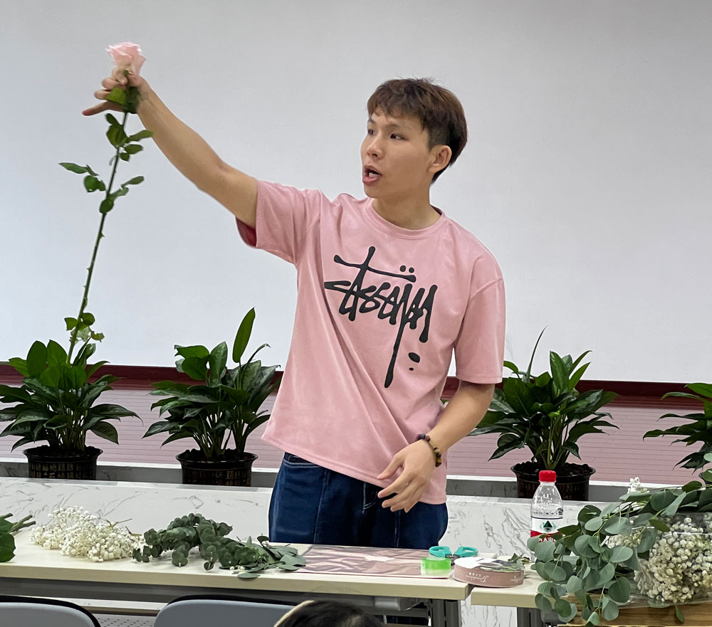 在老师的悉心指导下,大家大胆发挥自己的想象力,通过自己灵巧的双手,将经过修剪的多种花材,根据不同的色彩、形状,有层次地搭配在一起。