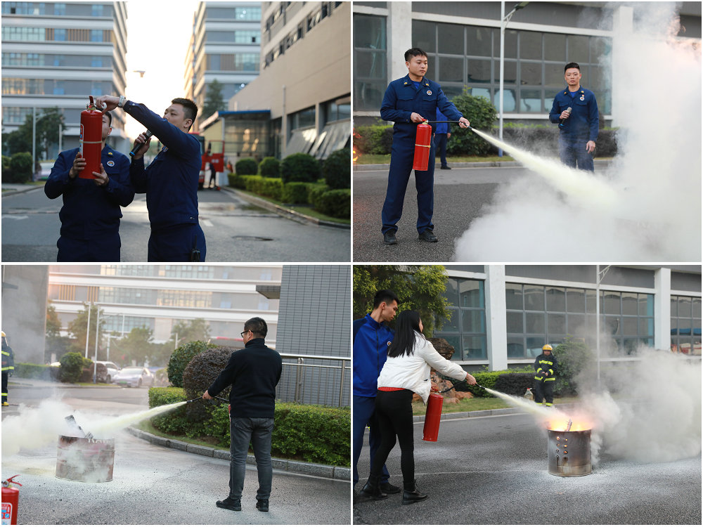 职工将“一提二拔三握四压”的灭火器使用口诀灵活运用到实战操作当中。
