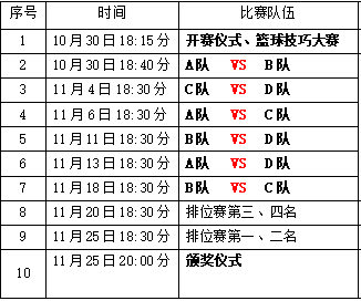 篮球技巧大赛项目为:运球绕桩、精准传球、运球上篮、投篮挑战,由4支球队分别挑选2名球员携女领队参与,完成比赛的时间最短的队伍获胜。