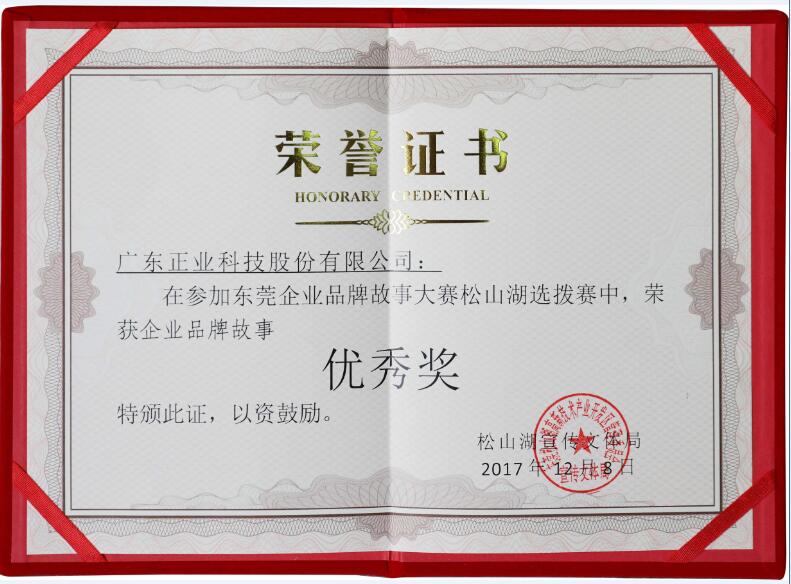 正业科技市场中心撰写的《风雨同舟携手廿载,匠心智造铸就未来》,以正业科技20年历程为蓝本,讲述正业科技自主创新走民族品牌之路的故事,荣获“东莞企业品牌故事大赛”松山湖选拔赛优秀奖。